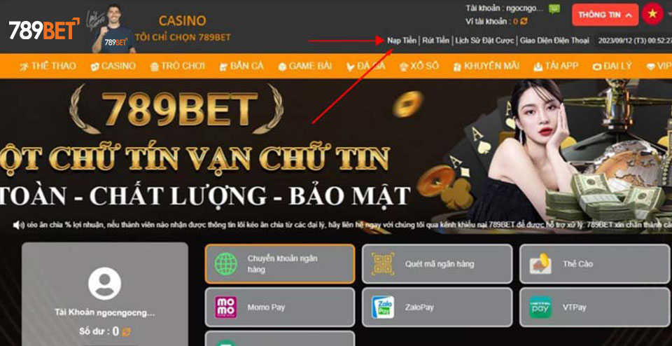 – Bước 1: Trên trang chủ của 789bet, bạn đăng nhập vào tài khoản cá nhân chính chủ. Sau đó truy cập vào mục Nạp tiền trên màn hình chính.